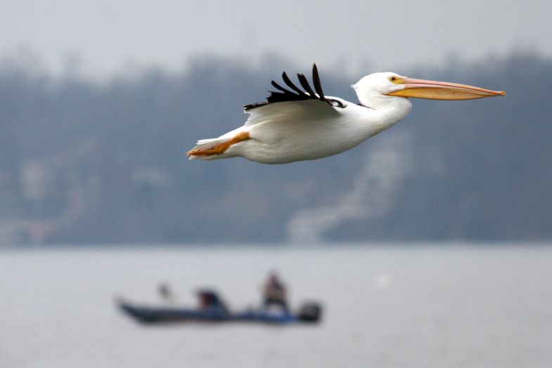 Photo: White Pelican at Wheeler Dam ignores fishermen