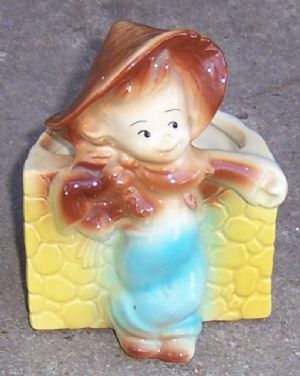 Store » Pottery/Art Pottery/Stoneware » Cute Pottery Planter of Farm Boy Leaning Against Yellow Brick Wall Vintage Decorative
